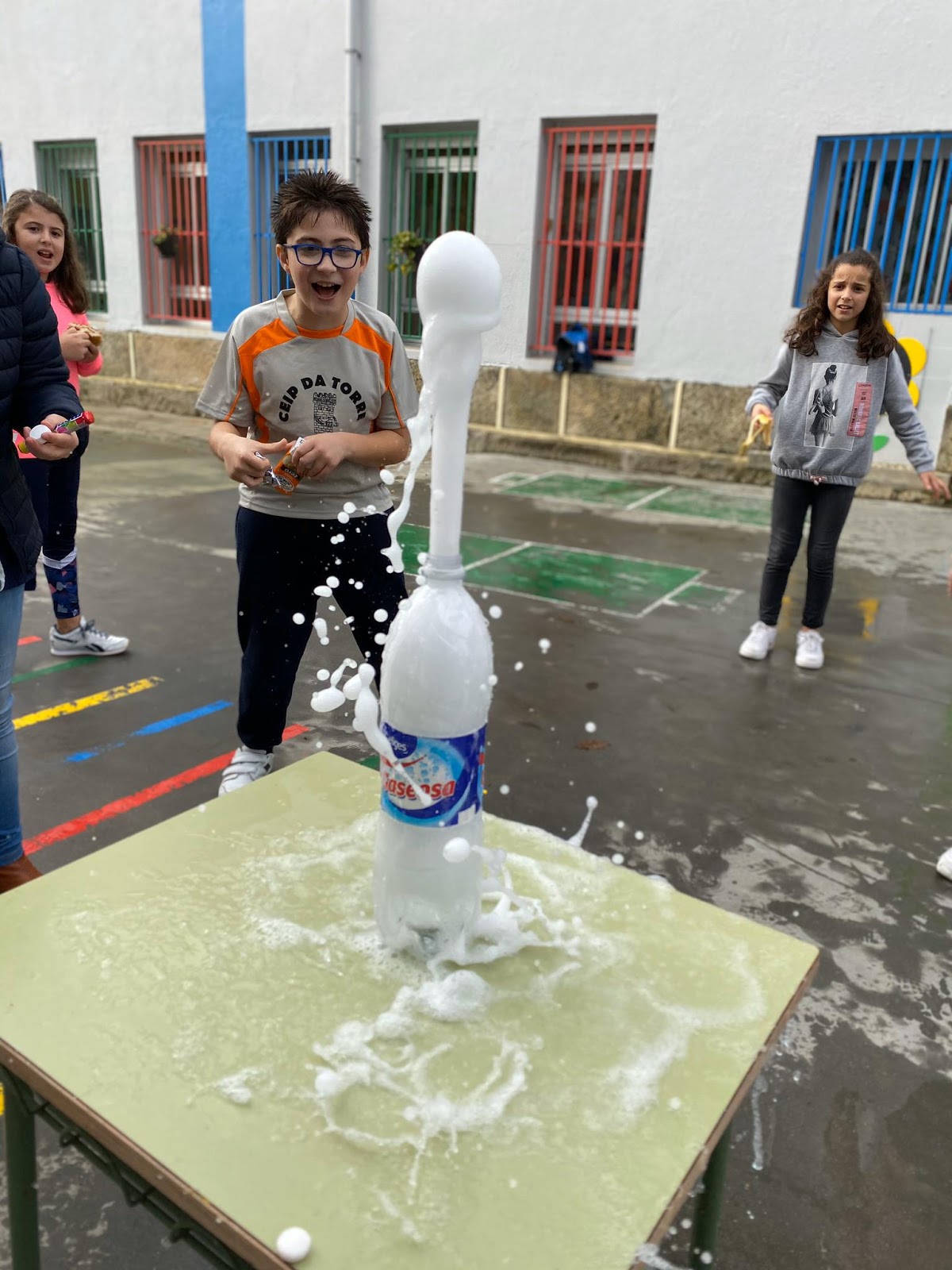 Esta semana fixemos os últimos experimentos na biblioteca. Inflamos globos con peta zetas e coca cola; fixemos burbullas hexagonais e saímos ao patio para facer unha explosión con bebida con gas e mentos. Foi moi divertido ser científicos!!!